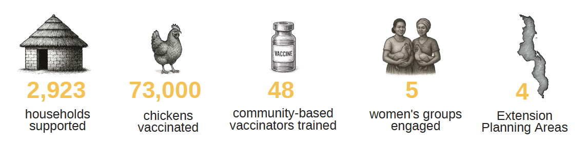 This year, we supported the establishment of community vaccinator programs in four new Extension Planning Areas (EPAs) across Dowa West District. A total of 48 Community-Based Vaccinators (CBVs) were trained and equipped to deliver regular Newcastle disease vaccinations. They’ve already vaccinated an estimated 73,000 chickens, benefitting nearly 13,000 people across 2,923 households.